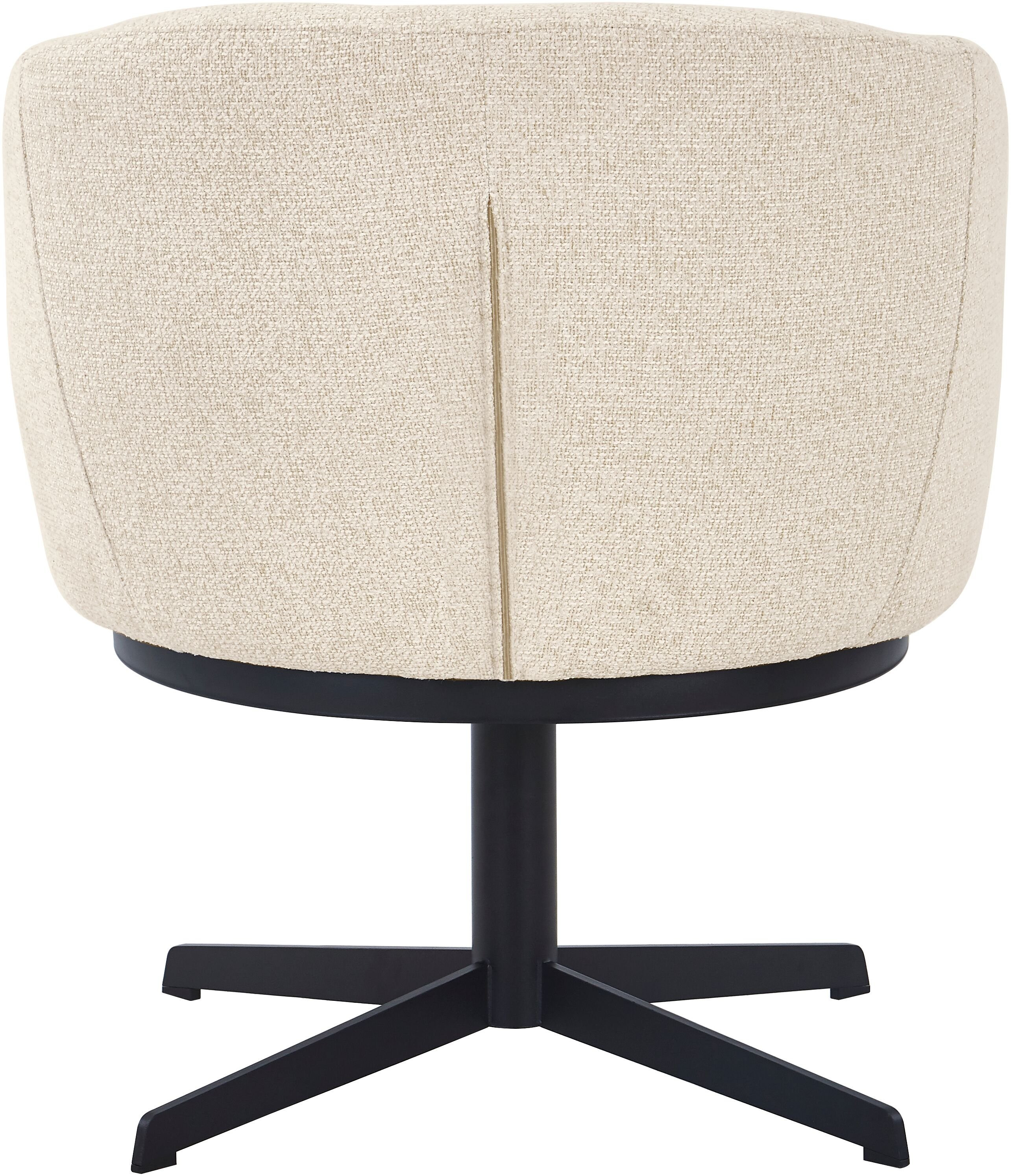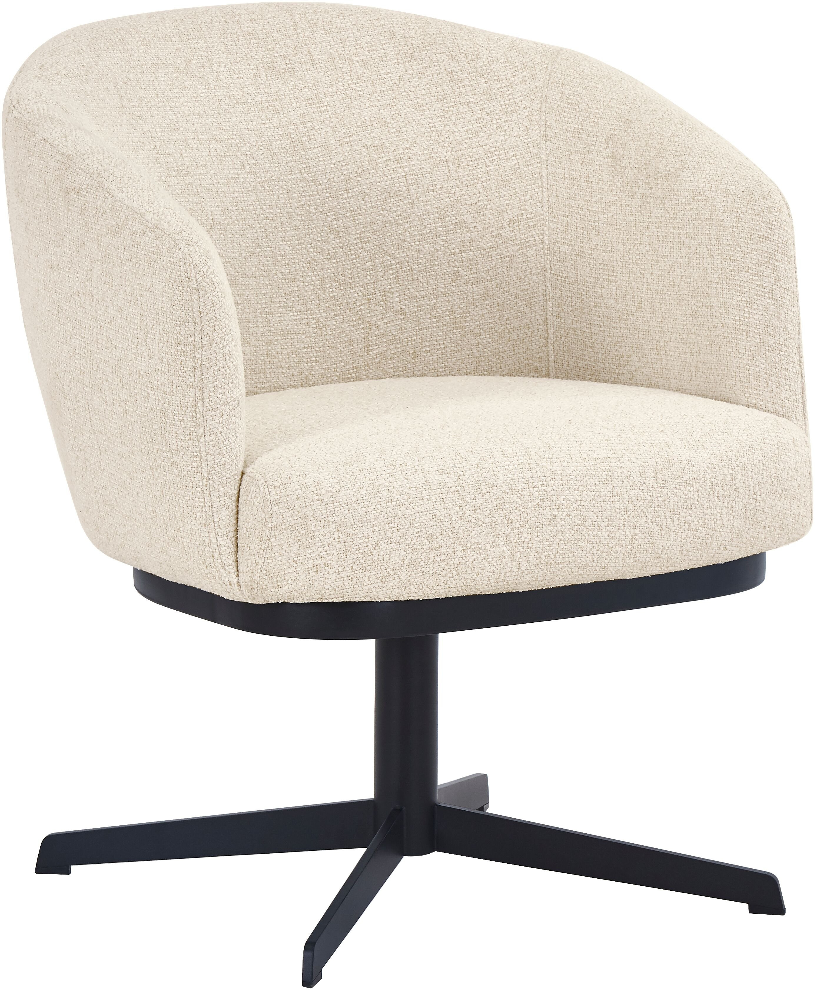 De Kingsford armstoel combineert comfort met een retro tintje. De afgeronde vorm en zachte stoffering in een naturel kleur (Puento 03) geven de stoel een warme uitstraling die moeiteloos past in zowel moderne als vintage interieurs. Het zwarte metalen onderstel met 360° draaifunctie maakt hem praktisch én veelzijdig. Afmetingen: H81 × B69 × D70 cm.