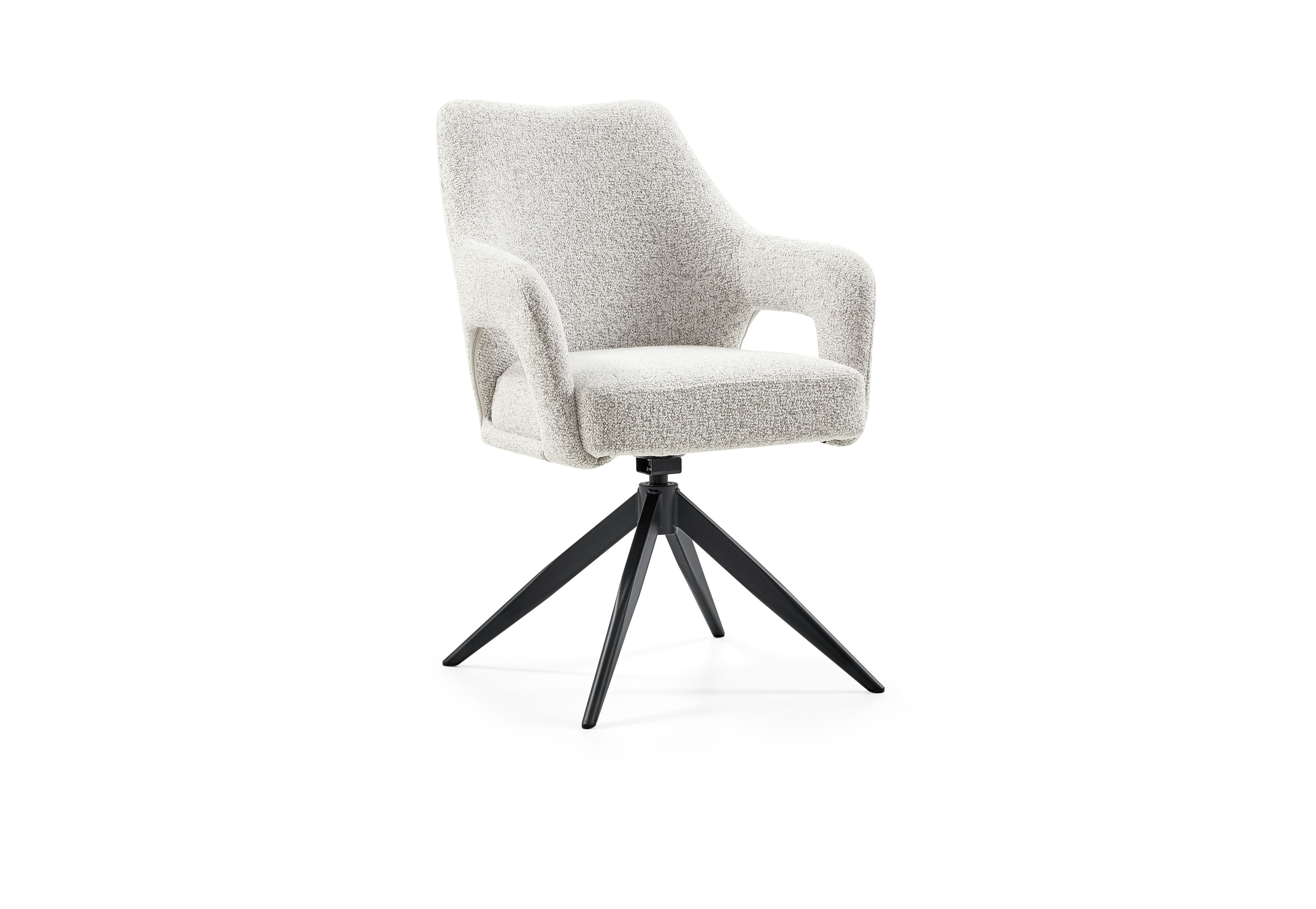De Rosebery armstoel met open armleuning oogt warm en speels door het sierlijke detail in de arm. Bekleed in de stof Perfect Harmony in beige brengt hij een zachte en natuurlijke sfeer in huis. Voorzien van een zwarte metalen poot met terugdraaifunctie voor extra gemak. Ideaal voor moderne en Scandinavische woonstijlen. Afmetingen: H87 × B58 × D64 cm.