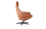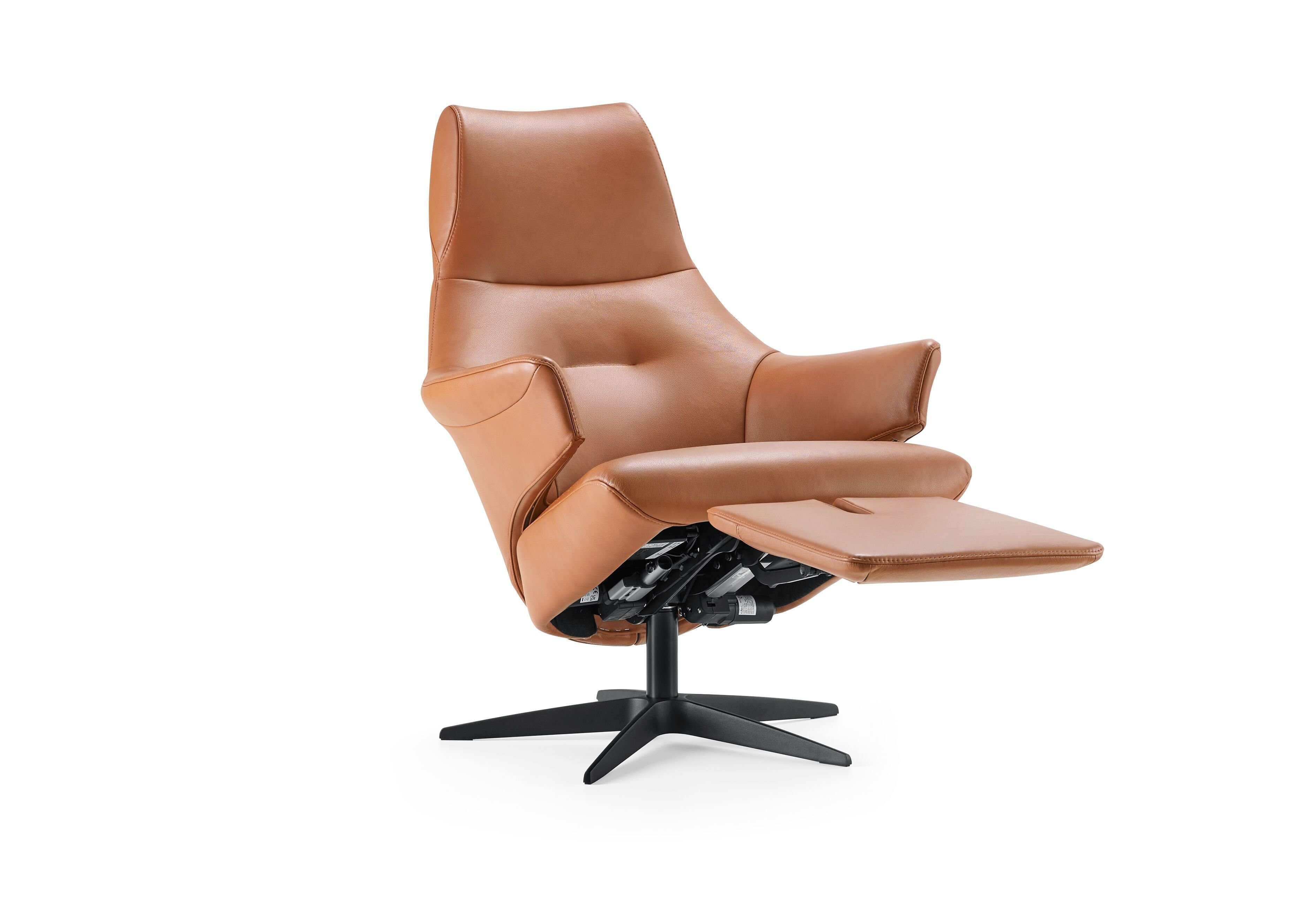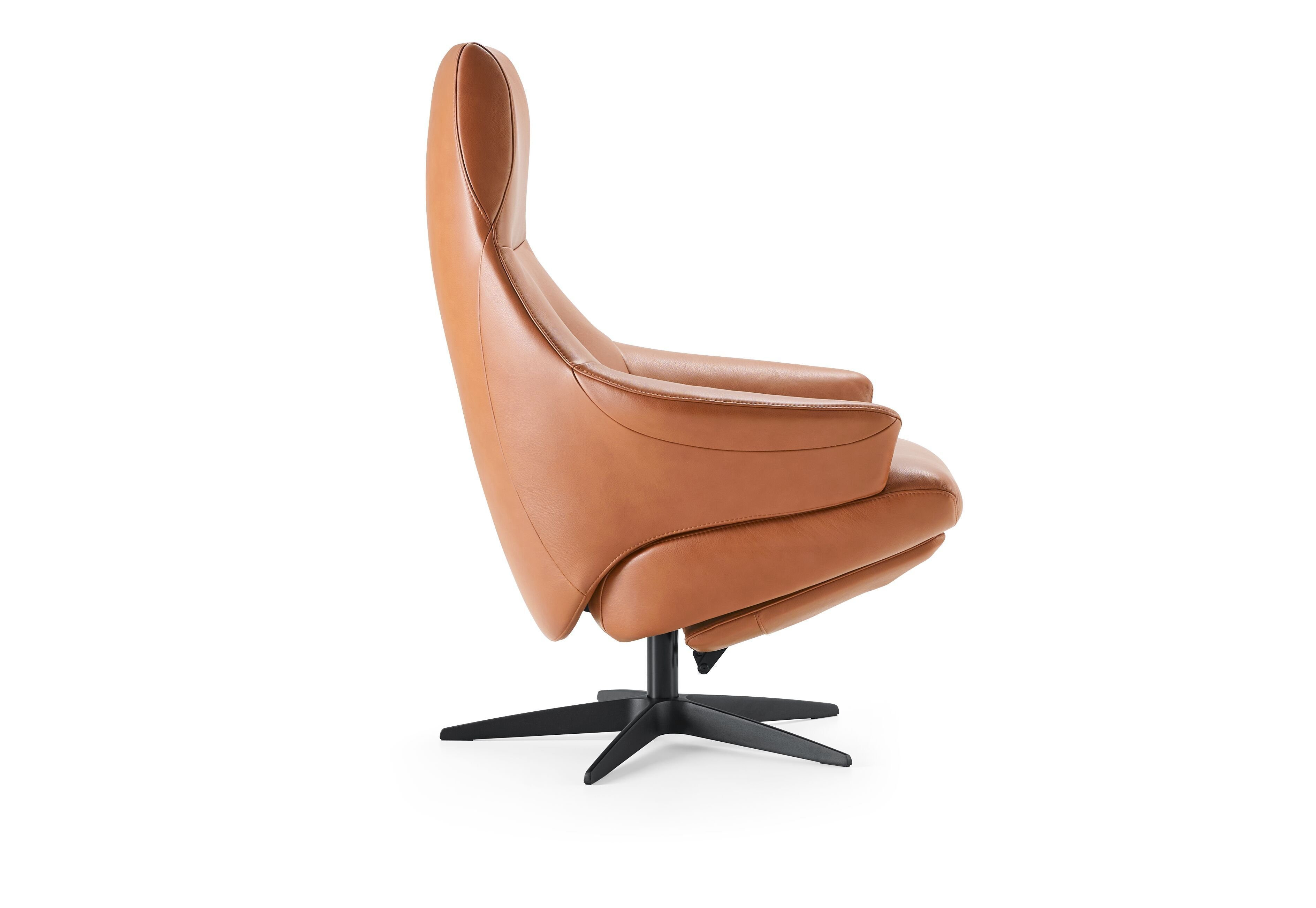 Deze relaxfauteuil straalt elegantie uit door zijn tijdloze design en verfijnde afwerking. Het rijke cognackleurige leder geeft een warme, luxe uitstraling, terwijl de hoge rug en geïntegreerde voetensteun uitnodigen tot pure ontspanning. Dankzij de slanke zwarte vijfteenspoot krijgt de fauteuil bovendien een moderne en luchtige touch en is het een echte eyecatcher in je woonkamer.